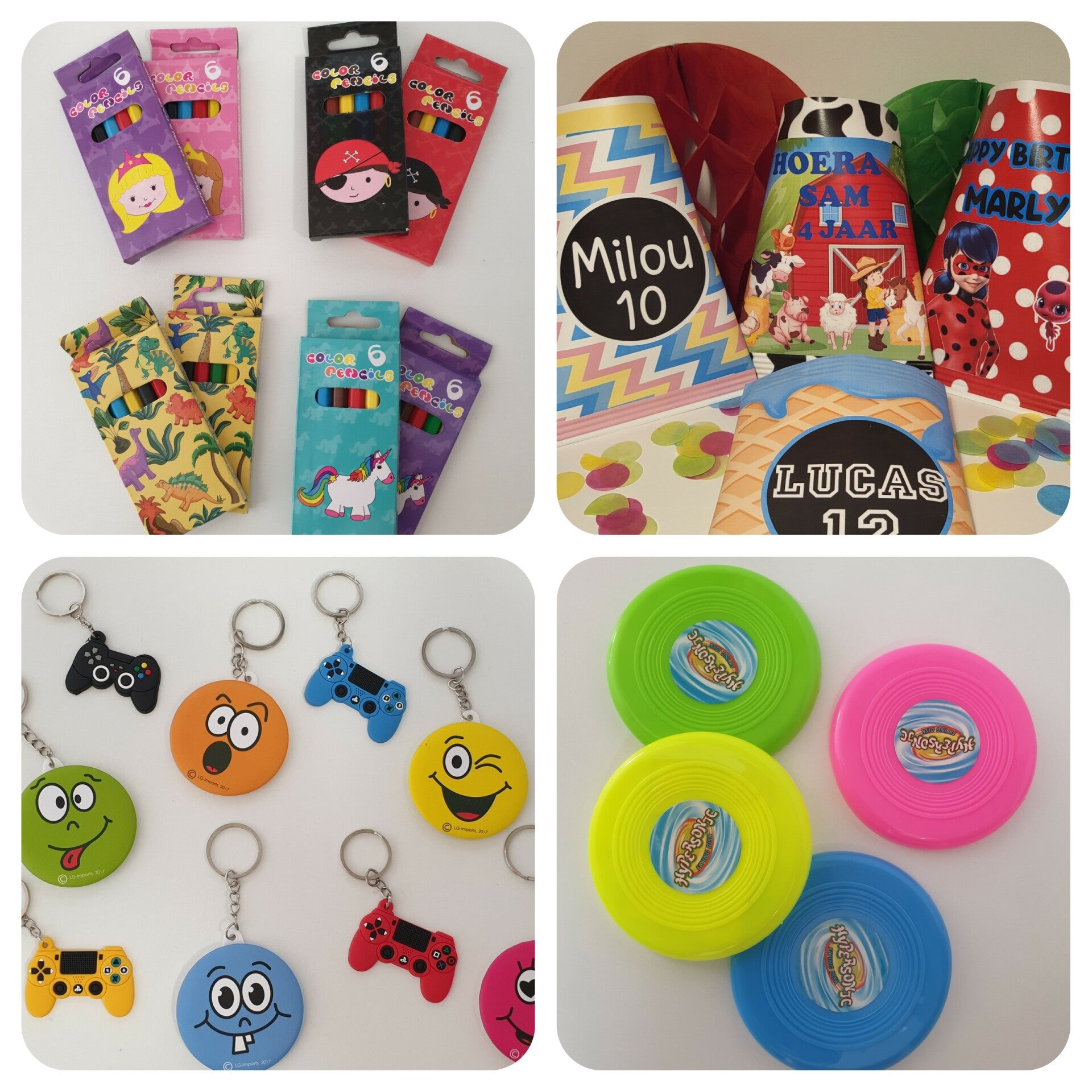 Bij een feestje horen natuurlijk vrolijke traktaties of juist een traktatie met een thema dino, prinses, smiley of een kleurrijke etui met naam. Van kant & klare traktatie tot aan zelf aan de slag met diverse uitdeelcadeautjes. Het is allemaal hier te bestellen. Hoe leuk is het als je kind mag trakteren op school, kinderdagverblijf of op de sportvereniging?